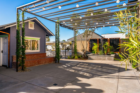 Located in the heart of the Village of Arroyo Grande, The Gallery offers a one-of-a-kind setting for intimate weddings, rehearsal dinners, corporate events, holiday parties, and celebrations of all types. The 1,250+ square foot indoor space and 900+ square foot outdoor patio can comfortably accommodate parties between 50-100 guests. The indoor space was thoughtfully designed, with rolling art walls that can be left as is or moved to one side to provide a large open area, allowing for versatility and customization unique to each event. The patio is surrounded by a 14ft pergola, adorned with vining roses and soft, ambient lighting. The west end of the patio features a modern steel fountain inside a small fish pond, backlit by an iron mosaic of monstera leaves.
